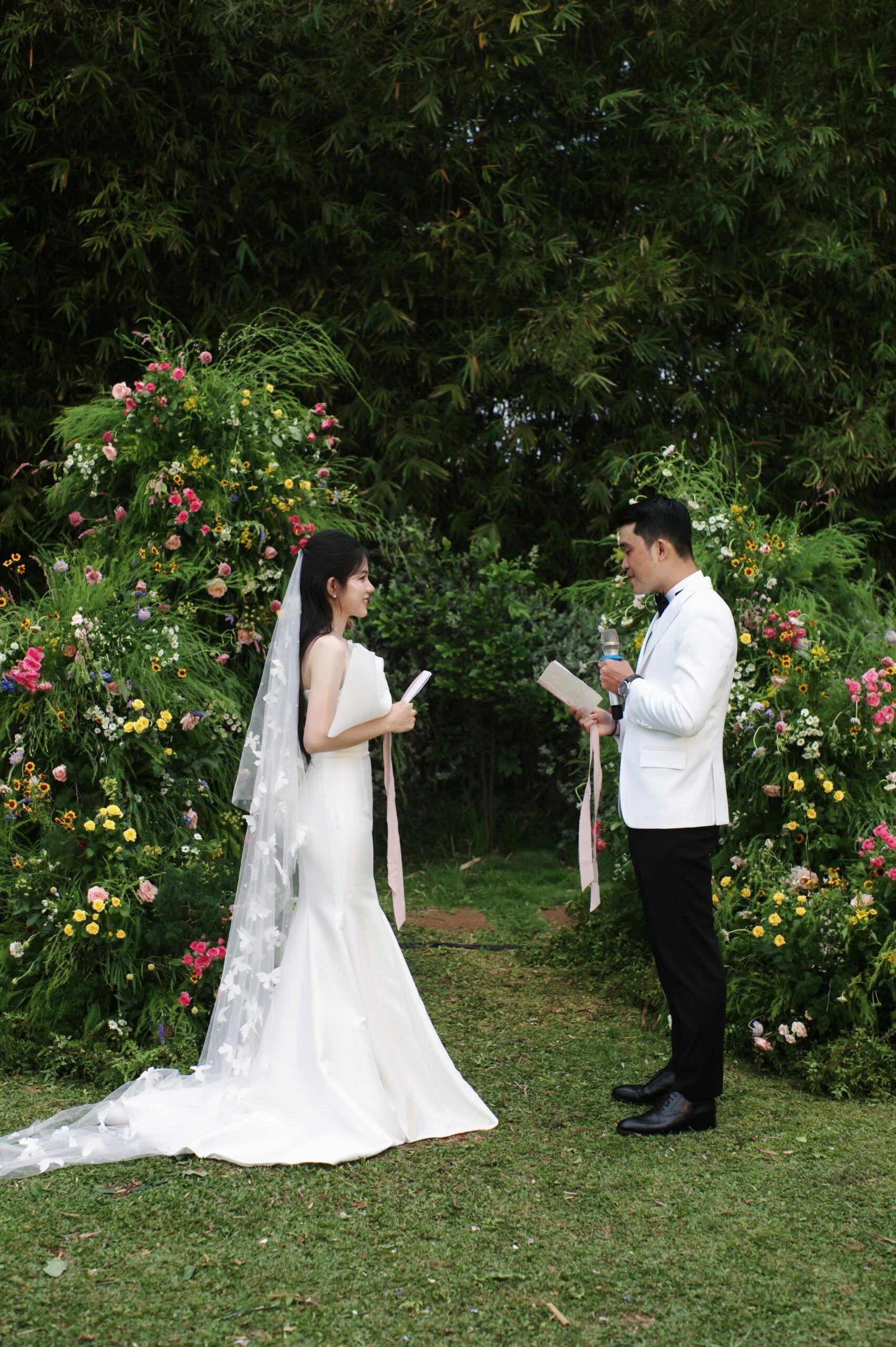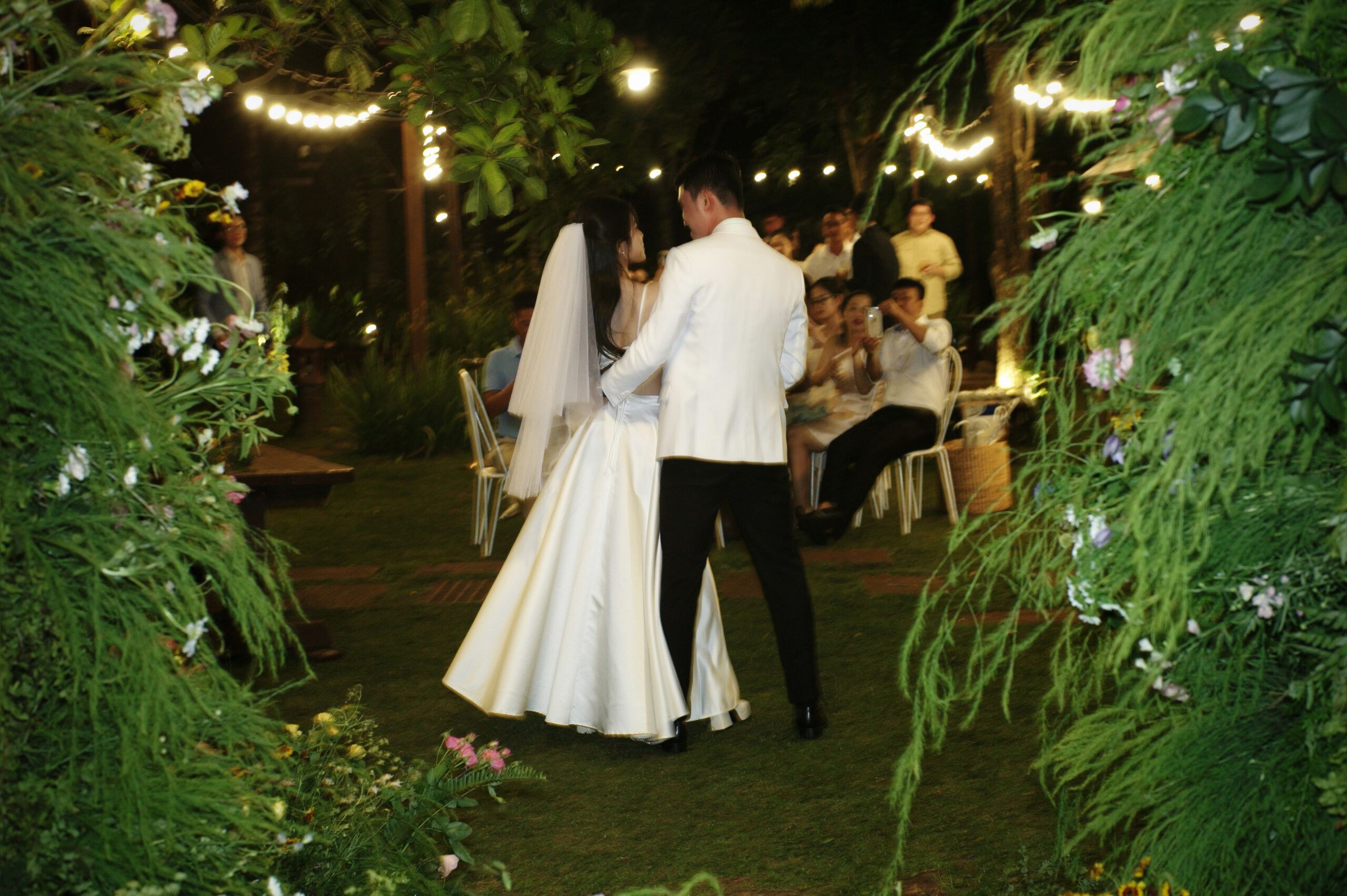 Hoa lá, chất liệu vải, ánh sáng,… đều được chọn sao cho phù hợp với câu chuyện riêng. Không phải chỉ vì đẹp, mà vì đẹp – hợp với đôi uyên ương đó. Chẳng hạn: một bó hoa cầm tay viền dây leo nếu cô dâu thích thiên nhiên hoang dã; hay chất liệu linen thô nếu cặp đôi yêu vẻ mộc mạc; hoặc décor ánh kim nếu muốn sang trọng.