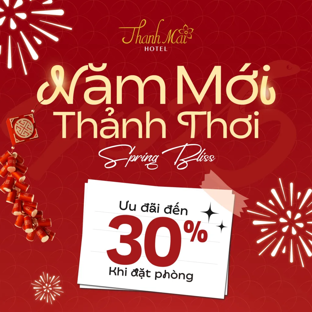 Hoà mình vào tinh hoa hương sắc Tết Việt tại Thanh Mai Hotel! Chuyến du xuân của bạn sẽ thêm phần trọn vẹn với ưu đãi LÌ XÌ lên đến 30%. Tận hưởng những trải nghiệm dịch vụ đẳng cấp và đắm mình trong phong vị Tết cổ truyền.